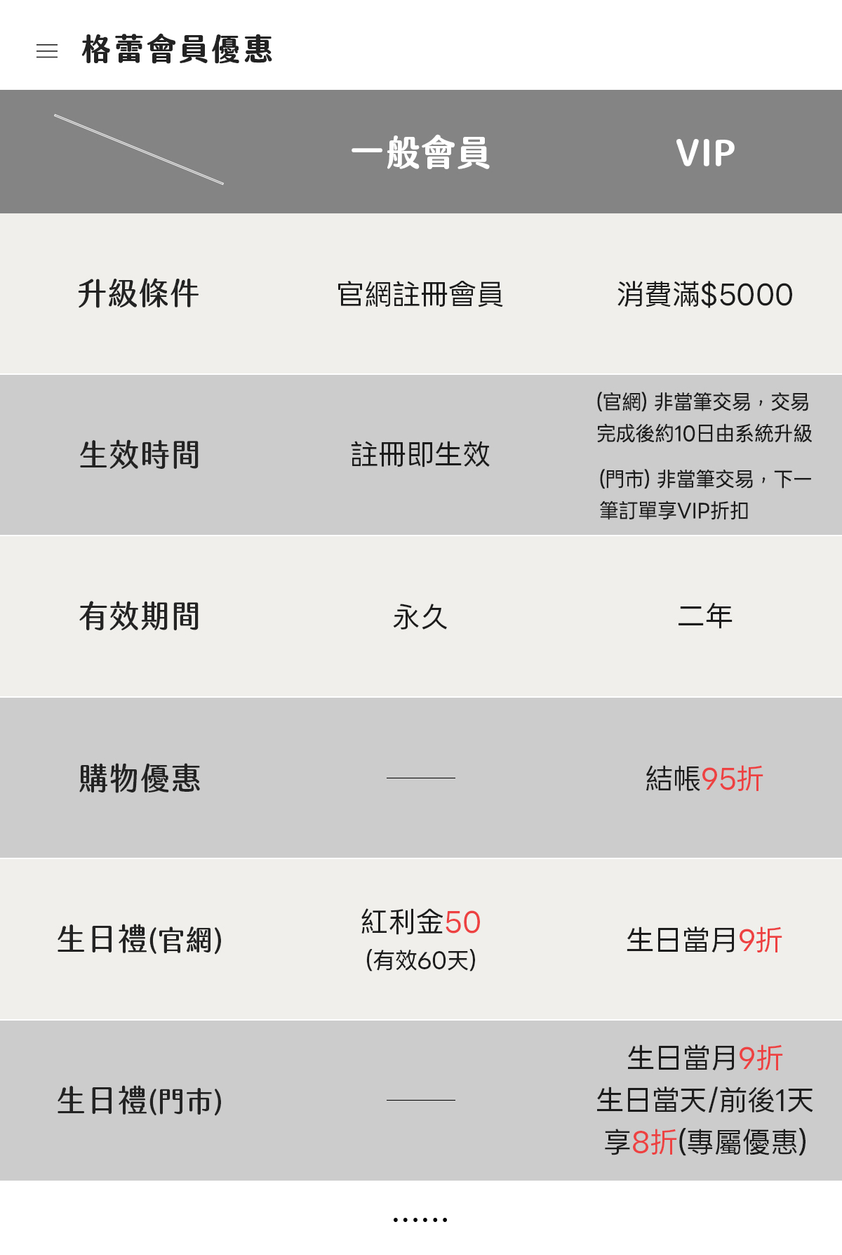 注意事項: 1.續VIP會員資格計算方式:結算前一天回推一年間累積實際消費金額,若符資格將於隔日更新於會員中心並啟用升級資格。 2. 不同的帳號無法合併累積金額,請於下訂時留意訂購帳號資訊 紅利點數說明: 1.壽星紅利點數於每月1號自動發送至會員帳戶中 2.紅利金與折扣碼優惠無法於同筆訂單使用 ※格蕾寢飾 Great Living 保有修改方案之權利※